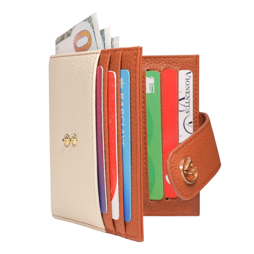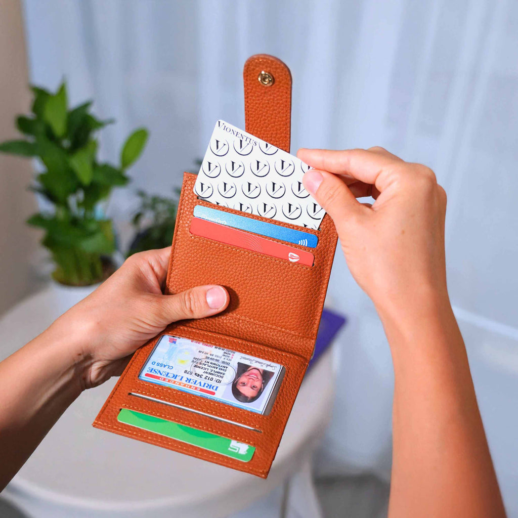 Our Women's AirTag Compatible Wallet by VIONENTUS stores up to 10 cards. It features one transparent window for an ID or driving license and two zippered pockets for cash and coins. Its functional design makes it easy to carry in your pocket, purse, or travel pack for added convenience.